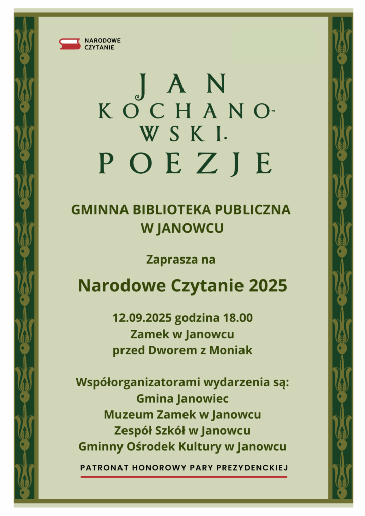 Zapraszamy na wyjątkowe wydarzenie literackie w malowniczej scenerii nadwiślańskiego wzgórza! W ramach ogólnopolskiej akcji Narodowe Czytanie 2025 spotkamy się w Muzeum Zamek w Janowcu (przy Dworze z Moniak), by wspólnie zanurzyć się w twórczość jednego z najwybitniejszych poetów polskiego renesansu – Jana Kochanowskiego.