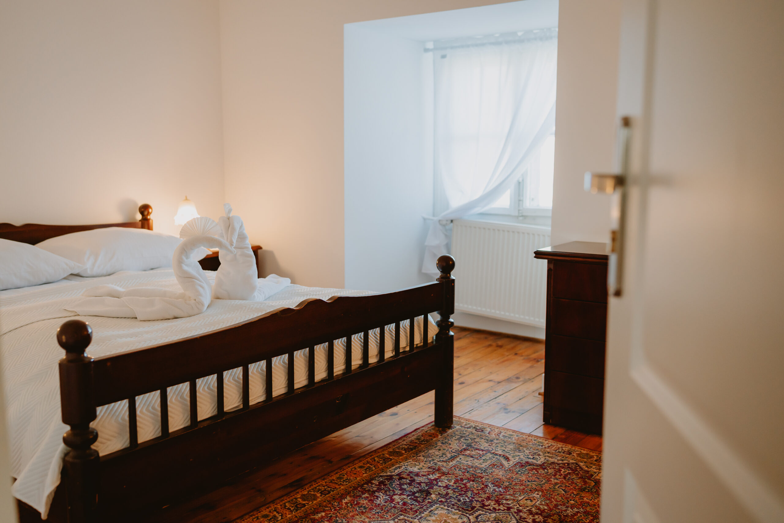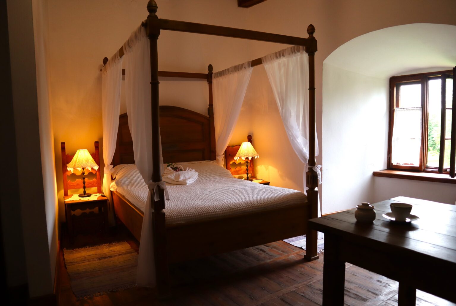 Dwuosobowy pokój o podwyższonym standardzie wyposażony w łoże z baldachimem, stylizowany na komnatę zamkową. Posiada podstawowe akcesoria do przygotowania porannej kawy i przekąsek.