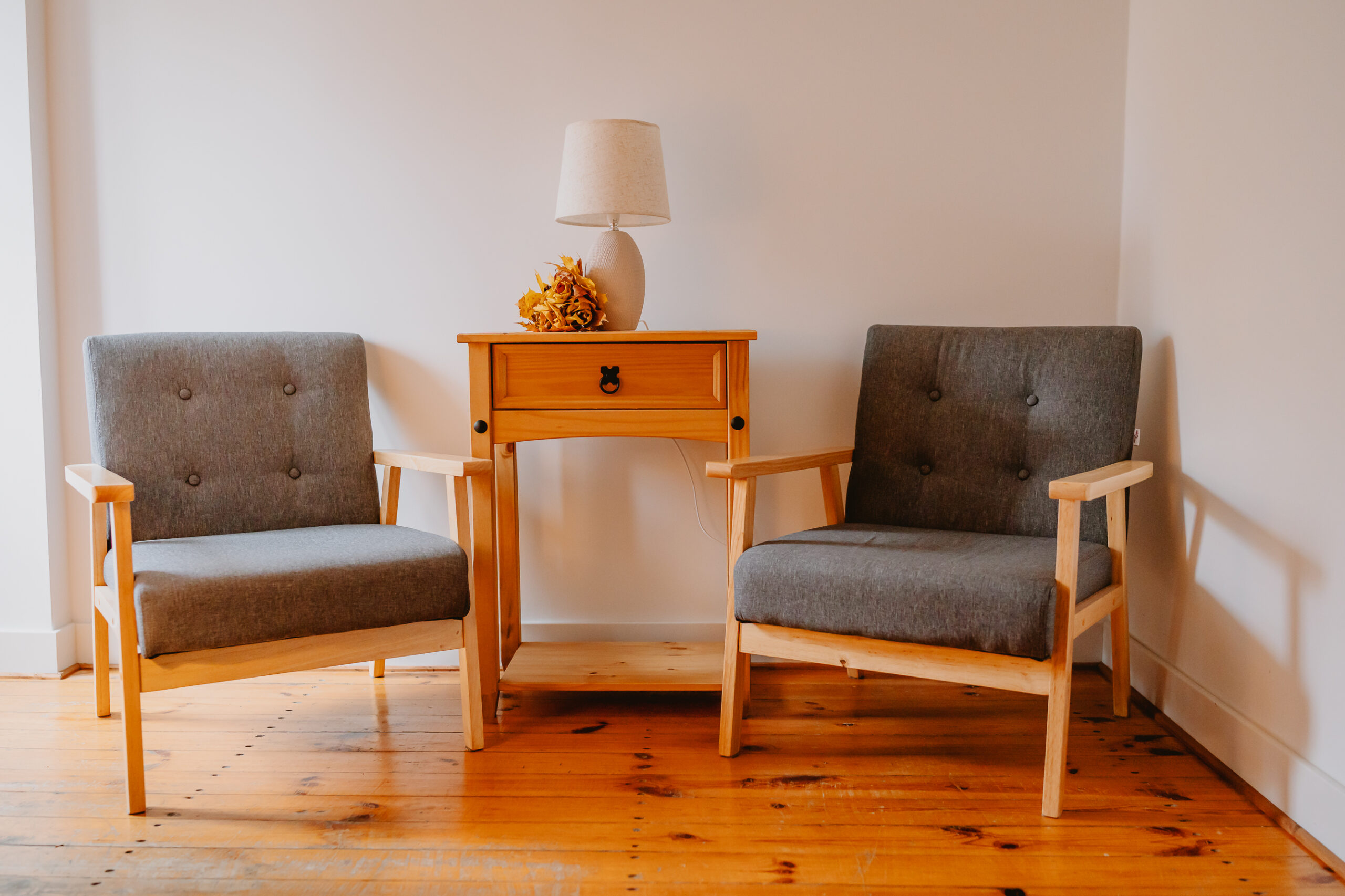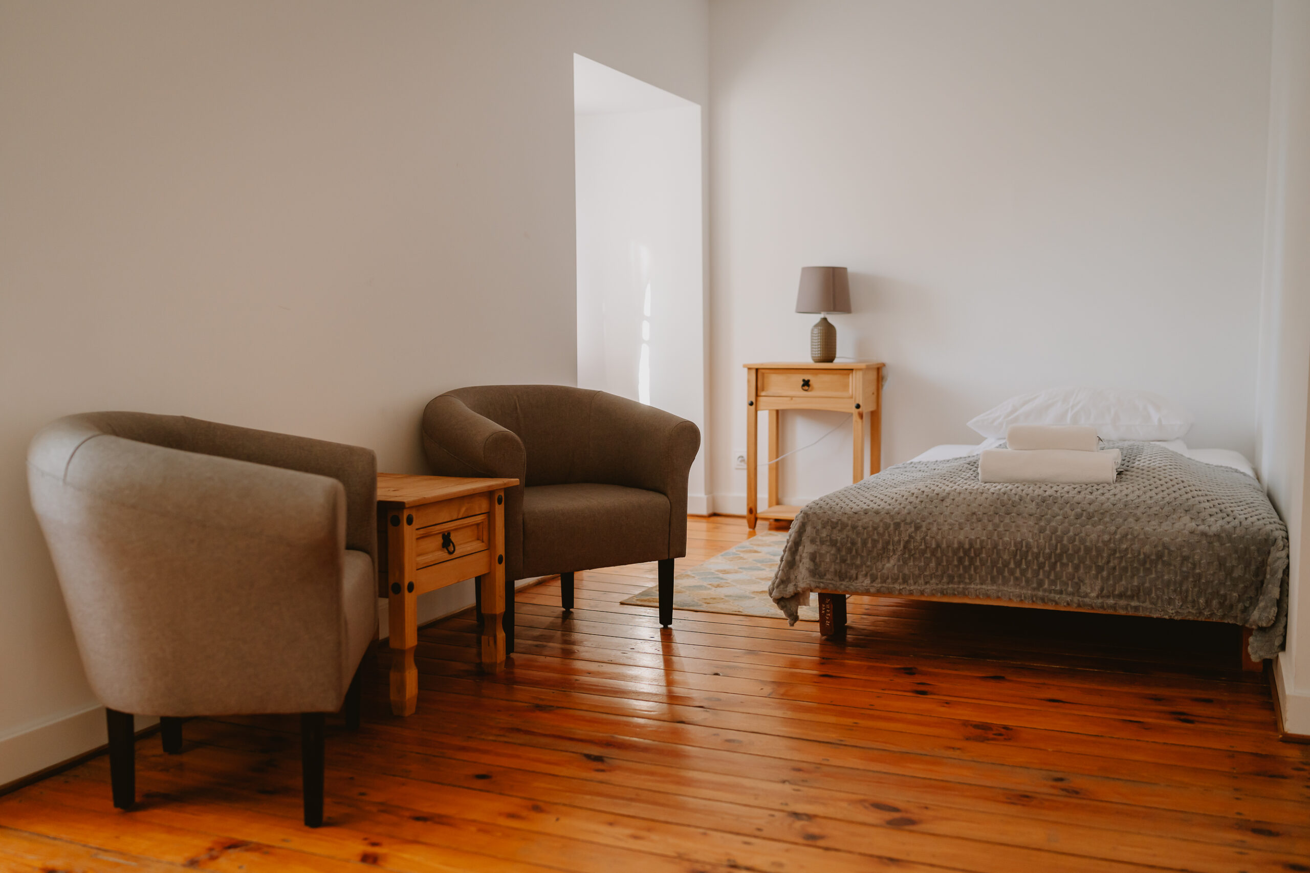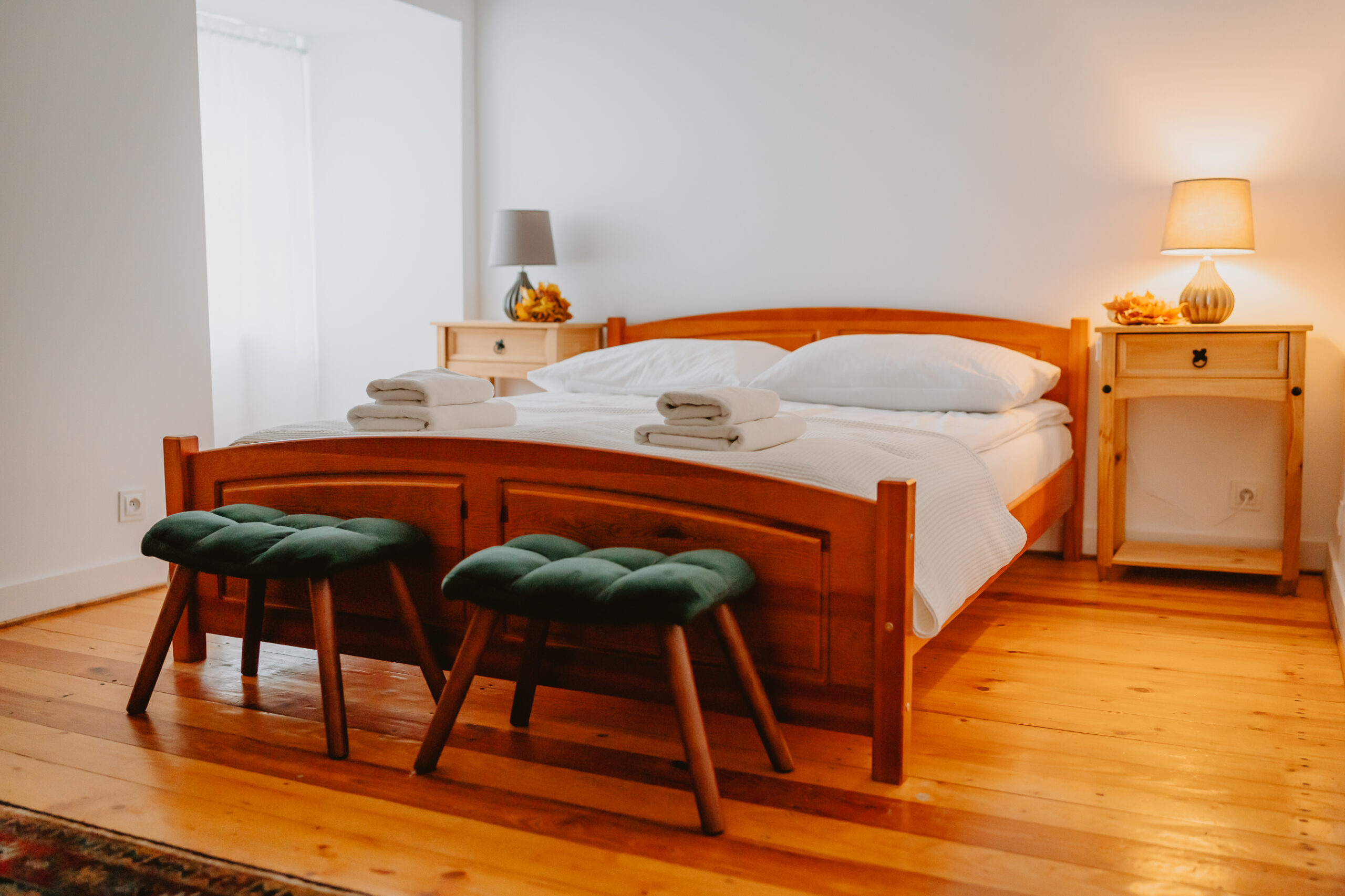 Dwuosobowy pokój wyposażony w łoże małżeńskie, szafki nocne, stolik z dwoma krzesłami, szafę ubraniową, w przedpokoju lustro i wieszak. Pokój posiada podstawowe akcesoria do przygotowania porannej kawy i przekąsek.