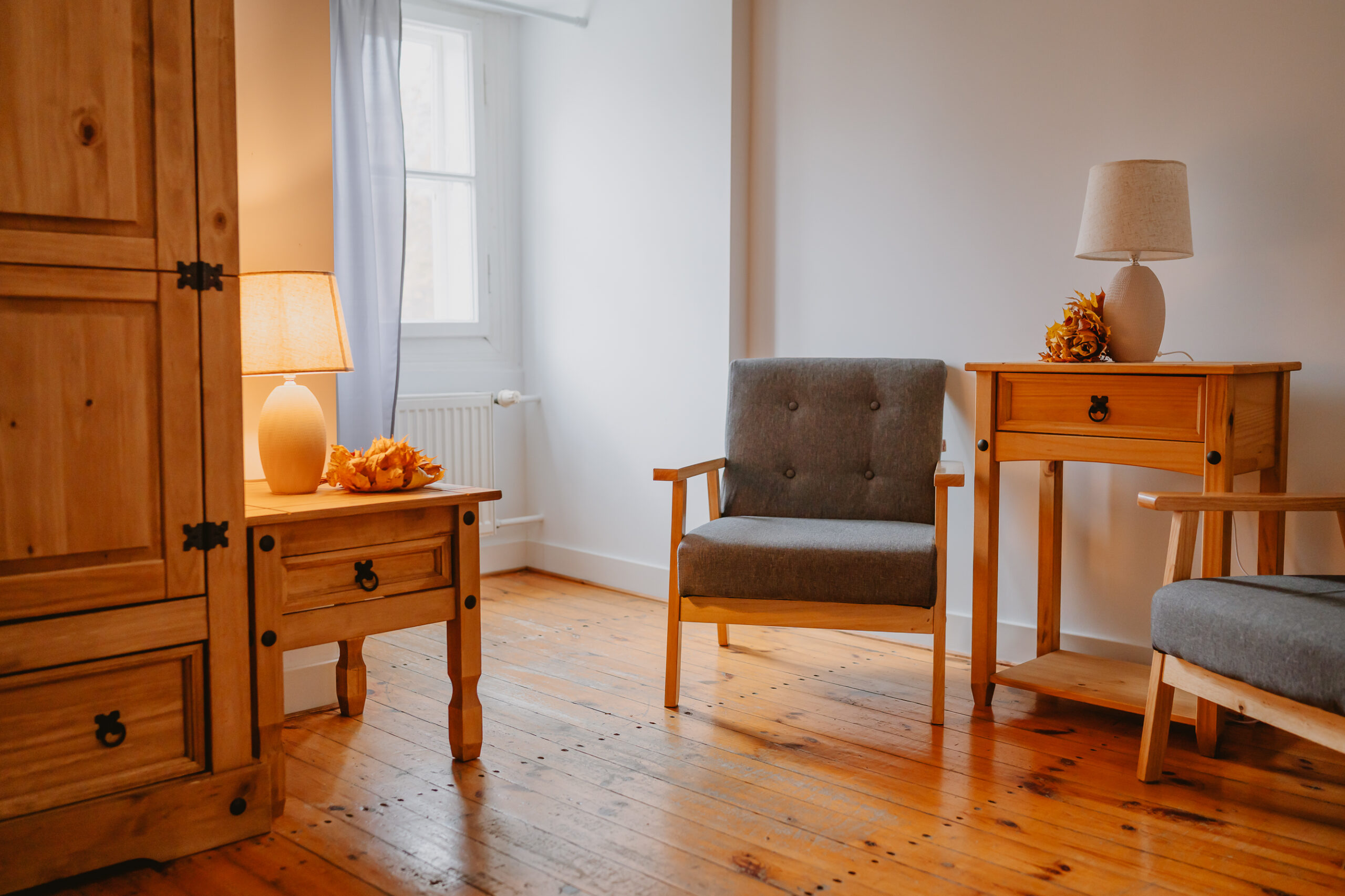 Dwuosobowy pokój wyposażony w łoże małżeńskie, szafki nocne, stolik z dwoma krzesłami, szafę ubraniową, kontakty przy łóżku.