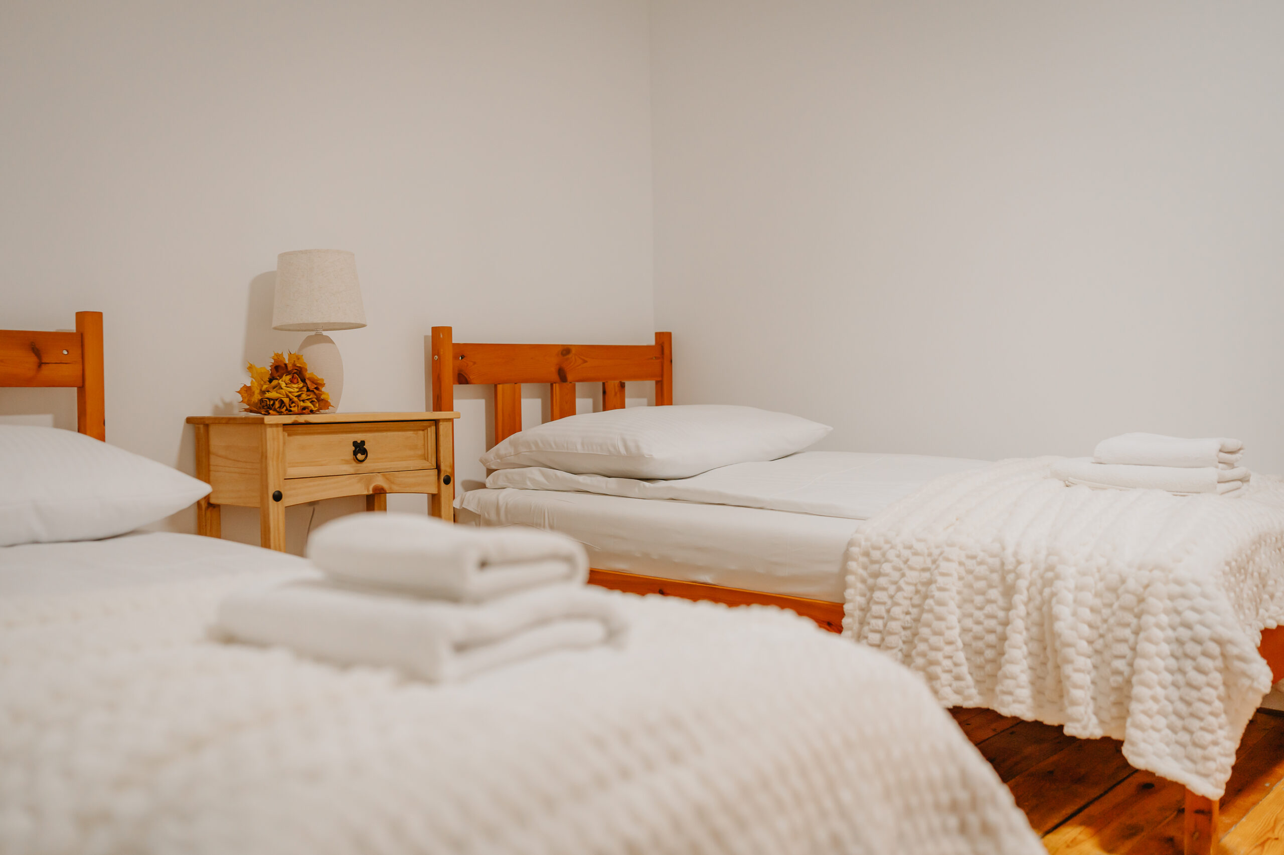 Dwuosobowy pokój wyposażony w dwa pojedyncze łóżka, szafki nocne, stolik z dwoma krzesłami, szafę ubraniową, kontakty przy łóżku.