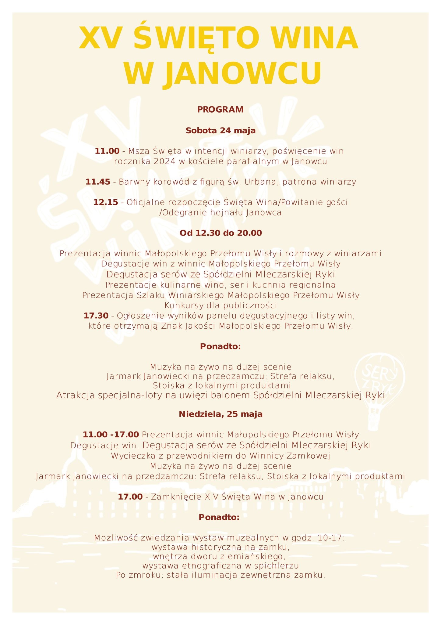 Widzimy się w najbliższy weekend, 24 i 25 maja – zarezerwujcie czas i dołączcie do nas! To będzie wyjątkowe święto dla wszystkich miłośników wina, dobrej kuchni i pięknych tradycji!